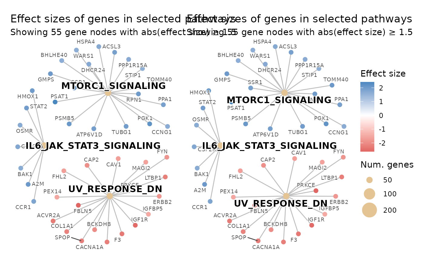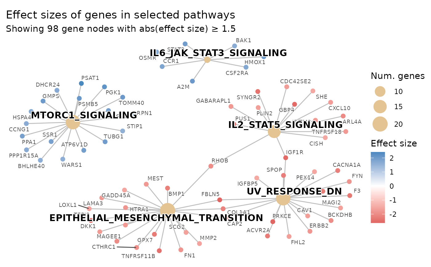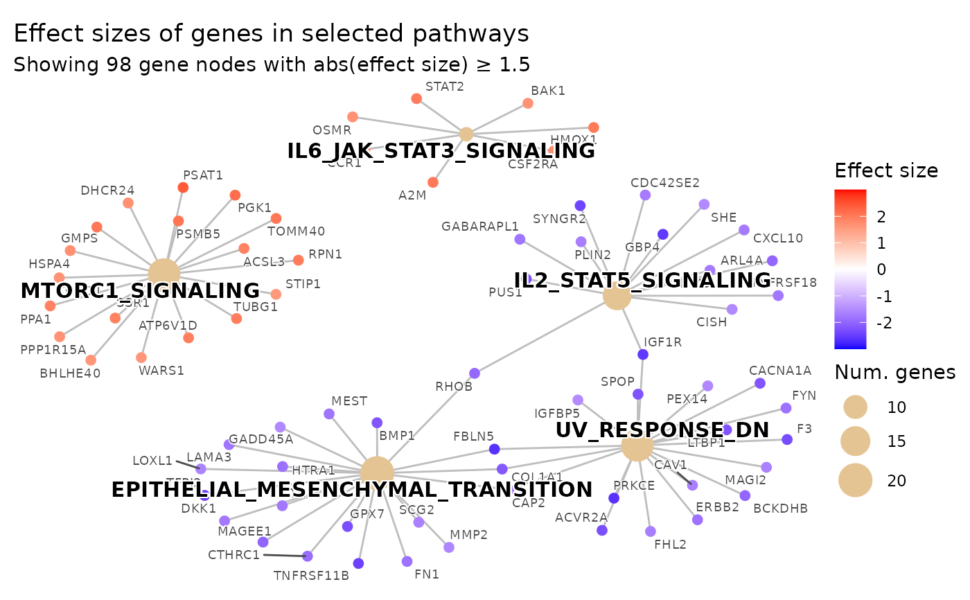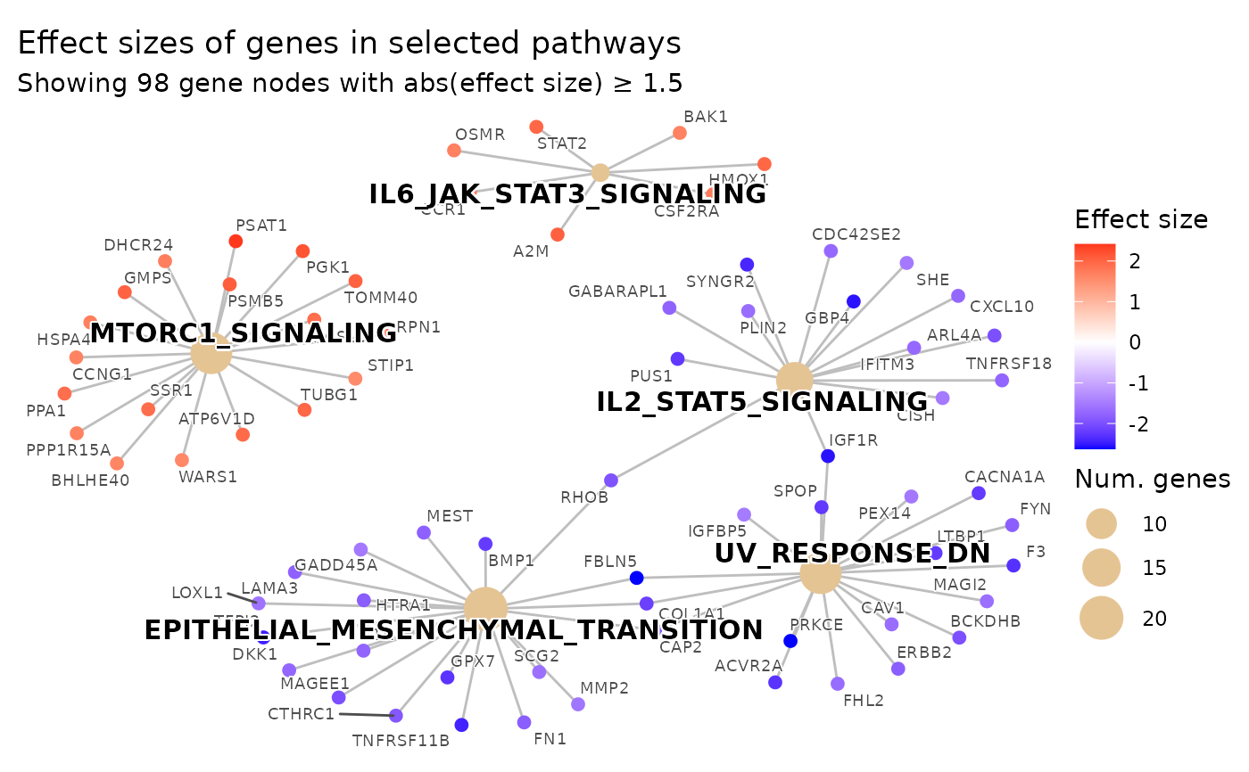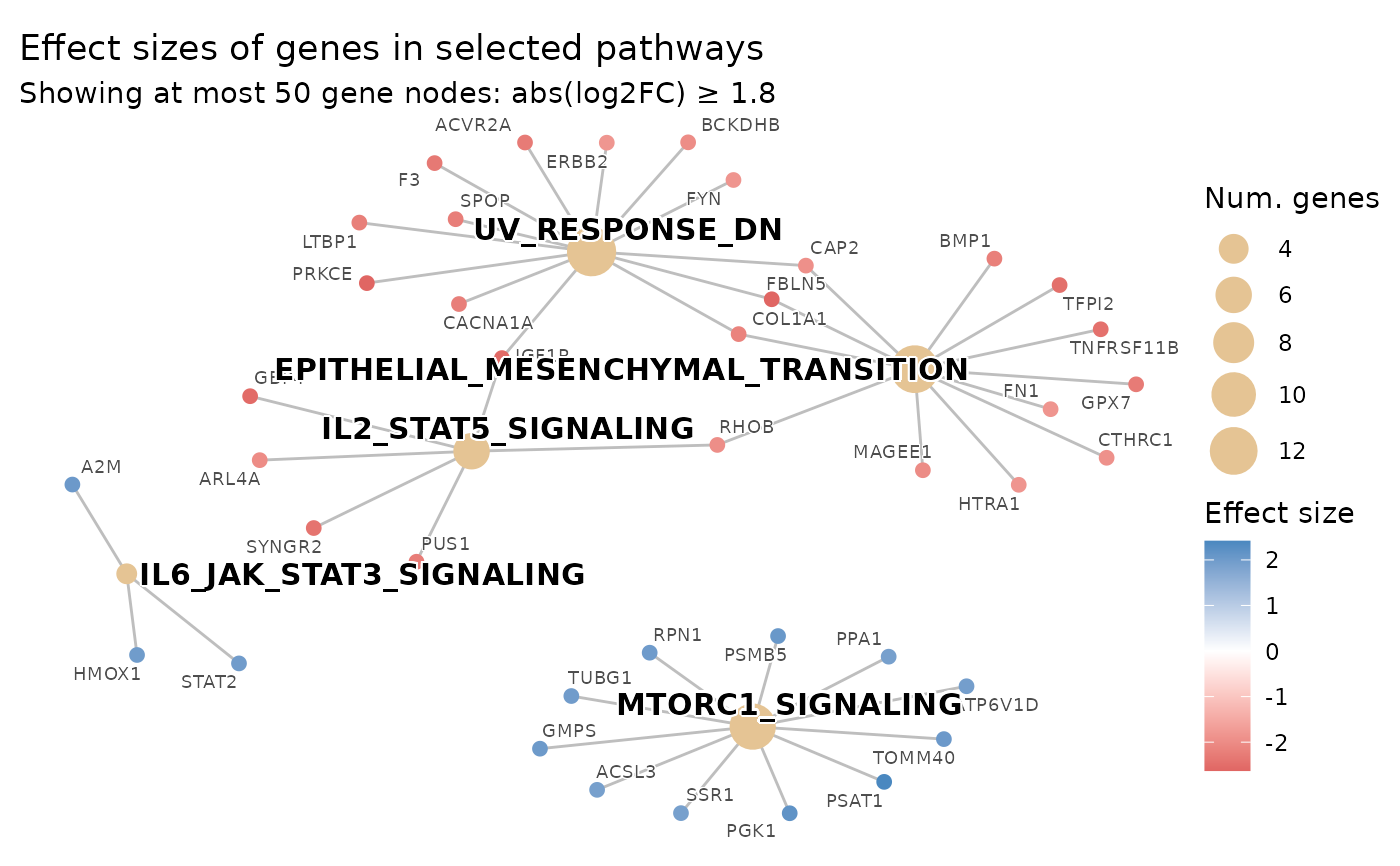 NULL, no limit). If the number of genes belonging to the topshow_pathwayspathways and passingeffect_size_thresholdexceeds this value, the threshold is raised adaptively (via quantile ofabs(effect_size)among pathway genes) until at mostmax_genes_showngenes remain. The effective threshold will never drop beloweffect_size_threshold. Must be a single positive whole number.- gene_node_size