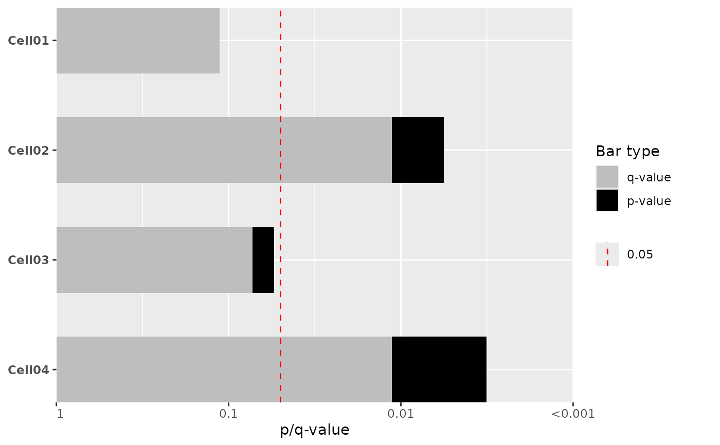 Logical; when TRUE compute FDR-adjusted q-values (Benjamini-Hochberg) (or use custom_qvalues if supplied) and draw two overlapping bars per row: both p and q are shown. Note on drawing order: